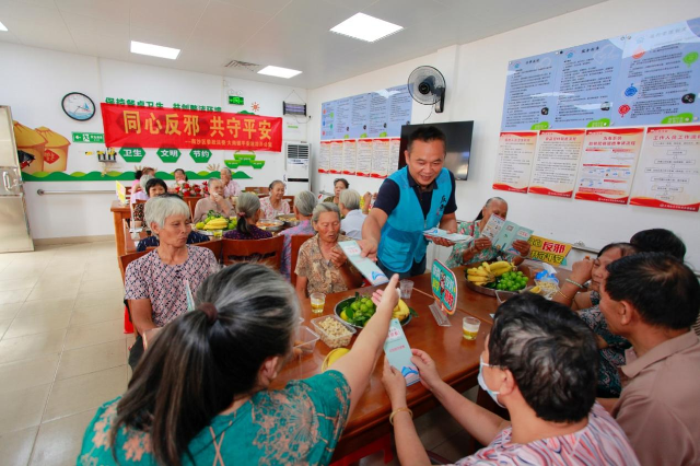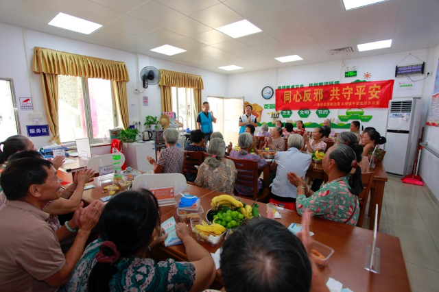 在享受美食的同时,大岗镇平安法治办公室的工作人员也借此机会,向长者们宣传反邪教知识,通过设立宣传展板、发放宣传册、播放反邪教视频、开展知识问答等形式,向长者们普及邪教的危害以及如何识别和防范邪教。工作人员强调,邪教不仅破坏家庭和谐,还危害社会稳定,每个人都应该提高警惕,共同维护社区的平安和谐。此外,针对当前在老年人群体中多发的养老诈骗骗局,工作人员结合实际案例和当前养老诈骗的常见手法,如提供虚假养老服务、以房养老诈骗、投资理财骗局等,向长者们进行了详细的讲解和警示。
